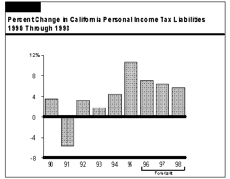 We project that the underlying trend in PIT revenues (that is, revenues adjusted for special one-time anomalies) will continue to expand in line with the strengthening California economy over the next three years. After removing the effects of the elimination of the temporary top marginal tax brackets as well as the Governor's proposed tax reductions, we forecast that underlying PIT liabilities will increase at an average annual rate of 6.5 percent during the 1996 through 1998 period. This is modestly above the 5.8 percent average annual gain projected for statewide personal income.