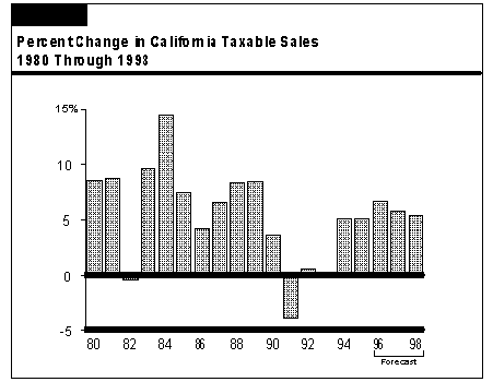 The outlook for the sales tax is primarily determined by the strength of taxable sales. As shown in Figure 11, spending in terms of taxable sales has mirrored overall economic activity in the state over the past 15 years. It grew strongly in the 1980s, declined in the early 1990s, and rebounded as the California economic recovery gained momentum in 1994 and 1995. We forecast that taxable sales will continue to expand in