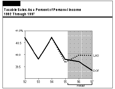 As shown in Figure 13 (see page 50), the LAO forecast assumes that the historical pattern will prevail in the current economic recovery, and that the ratio of sales to income will remain fairly stable during the economic upturn over the next two years. In contrast, the administration assumes that the ratio will continue to fall to an all time low by 1997. As an indication of the significance of these different views about the taxable sales ratio, a 0.5 percentage-point increase/decrease in the ratio is equal to about $210 million more/less in annual state revenues.