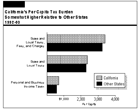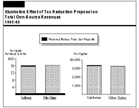 Figure 6 provides an illustration of the effect of the Governor's tax reduction proposal on the overall state tax burden. We calculated the impact of the Governor's tax proposal by applying the fully phased-in percentage tax reduction to 1992-93 California total own-source revenue levels (as specified in Figures 2 and 3--page 99). Total own-source revenues without incorporating the tax proposal are about 2 percent lower than the average for other states per $100 of personal income. After incorporating the effects of the tax reduction, California's overall tax burden would be 5 percent lower than other states. Similarly, in per capita terms, California's overall tax burden without incorporating the tax reduction proposal is about 4 percent higher than other states. Under the proposal, the total tax burden would be about 1 percent higher than other states. Thus, in terms of overall tax burden, California still would be about average.