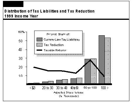 Figure 7 compares the distribution of tax returns filed, current-law tax liabilities, and the tax savings projected to be received by individuals under the proposal in 1999. It shows that tax savings are generally proportional to total tax liabilities. For example, individuals with adjusted gross income over $100,000, who would account for almost 10 percent of tax returns filed, would pay over 55 percent of the total tax liabilities. These taxpayers would receive over half of the tax savings under the proposal. Taxpayers with income under $50,000, who would account for over 60 percent of returns filed, would receive about 17 percent of the tax reduction. This amount is slightly higher than their share of current-law total tax liabilities.