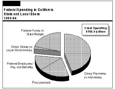 Federal spending in California totaled $155.4 billion in FFY 94 (the most recent data available) and exceeds the combined own-source revenues of the state and local governments from taxes, fees, and user charges. However, most of this federal spending is outside the state budget. Figure 1 shows that more than three-fourths of federal spending in California in 1993-94 (reflecting 1993-94 state figures and FFY 94 federal data) did not flow through the state budget or go to local governments. The largest component of this "direct" federal spending was for payments to individuals (primarily Social Security and Medicare)--about $71 billion.