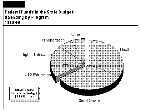 As Figure 2 (page 151) illustrates, two-thirds of the federal funds that the budget estimates that the state will spend in the current year will be for health and social services programs. Of this amount, $10.2 billion is for health programs and $10.6 billion is for social services programs.