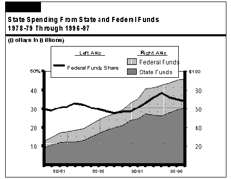 State spending from federal funds peaked briefly at 33 percent in 1982-83, then declined gradually to a low of 27 percent in 1987-88, and peaked again (at 38 percent) in 1993-94. This pattern follows the course of the state's economy over this period, except that it moves in the opposite direction to these economic cycles (hence the term "countercyclical"). That is, the federal share of state spending increases in response to economic slowdowns and declines during times of strong economic growth. The 1982-83 and 1993-94 peaks in Figure 4 occurred in response to the recessions of 1982 and the early 1990s, respectively. During the late 1980s, California experienced strong economic growth and the federal share of state spending declined.