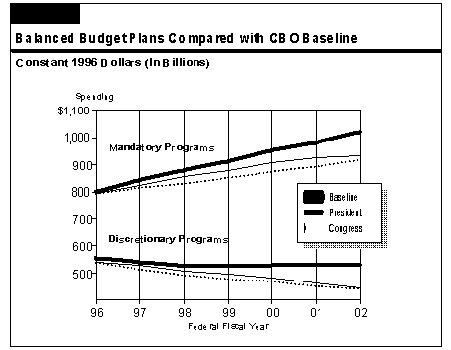 Figure 6 (see page 162) illustrates spending for mandatory and discretionary programs under each of the two budget-balancing plans through 2002 compared with CBO's December baseline spending estimates. The spending figures are presented in constant (that is inflation-adjusted) 1996 dollars. The spending amounts shown for the Congressional Plan are from CBO's December 1995 Budget Update and reflect the estimated savings that would have been achieved had the Balanced Budget Act been signed in November 1995.
