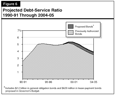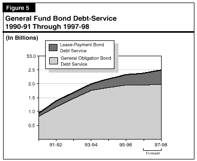 Debt service for lease-payment bonds is becoming a greater portion of total debt service costs, as shown in Figure 5. For example, lease-payment debt service was 13 percent of total debt service in 1990-91 and will increase to 21 percent in 1997-98.