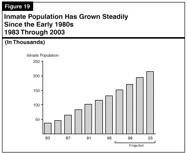 As of June 30, 1996, the CDC housed 141,017 inmates in prisons, fire and conservation camps, and community correctional facilities. Based on the fall 1996 population forecast prepared by the CDC, the Governor's budget assumes that the inmate count will reach 150,970 by June 30, 1997, and increase further to 159,823 by June 30, 1998. These figures represent an annual population increase of 7 percent in the current year and 5.9 percent in the budget year. As can be seen in Figure 19, this continues an upward trend in the prison population that has persisted since the early 1980s.