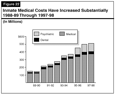 The new delivery system is intended not only to improve inmate medical and mental health services, but also to find more cost-effective means to provide these services. Between 1988-89 and the proposed 1997-98 budget, the CDC's annual budget for medical, dental and mental health services has increased almost fourfold, to $508 million. During the same timeframe, in contrast, the CDC inmate population has just doubled. Figure 22 shows the growth of CDC medical costs. A central concept behind the new system was that better service delivery and management would result in lower medical costs.