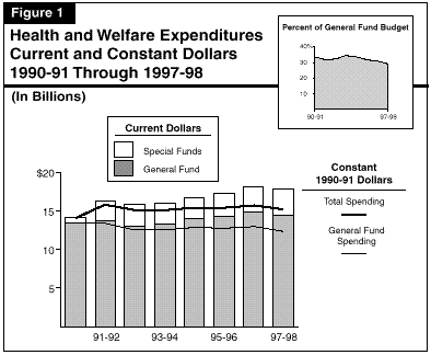 Figure 1 (see next page) shows that General Fund expenditures for health and social services programs are projected to increase by $1.2 billion, or 8.7 percent, between 1990-91 and 1997-98. This represents an average annual increase of 1.2 percent.