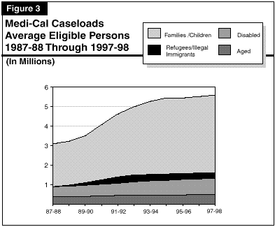 Medi-Cal caseloads increased by 81 percent over the last decade. As Figure 2 shows, most of this growth occurred during the period from 1989-90 through 1994-95. The growth in the number of families and children receiving Medi-Cal during this period reflects the rapid growth in AFDC caseloads during this time as well as the expansion of Medi-Cal to cover additional women and children with incomes too high to qualify for cash aid in the welfare programs. Coverage of refugees and illegal immigrants also increased caseloads significantly during this period. Since 1994-95, overall Medi-Cal caseloads have grown much more slowly, due primarily to a slight decline in AFDC caseloads.