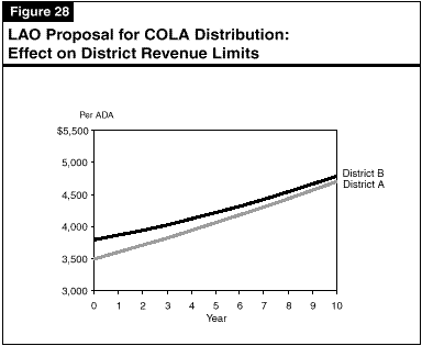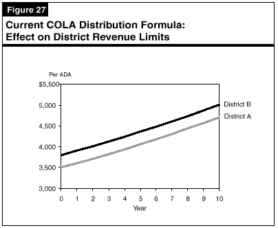 Current COLA Does Little for Equalization. The current uniform fixed-dollar COLA is described as a "percentage equalizing" COLA. Figure 27 illustrates the operation of this COLA over time using two hypothetical districts--A and B. Our illustration assumes District A's revenue limit is at the state average.