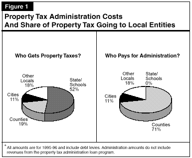 Under the current cost sharing system, counties pay more than 70 percent of the costs of administering the property tax, yet they receive less than 20 percent of property taxes collected. Cities, special districts and redevelopment agencies pay the remaining 30 percent of property tax administration costs. Schools, the largest recipients of property taxes, do not pay for property tax administration. While the cities, special districts, and redevelopment agencies pay a share of costs that is proportional to the revenues they receive from the property tax, counties pay a disproportionate share, since they in effect also must pay the school share (see Figure 1 on the next page).