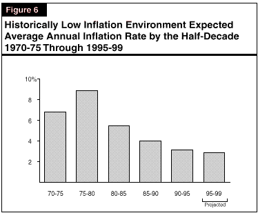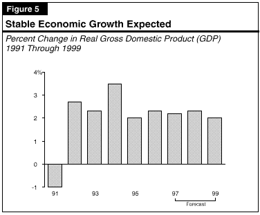 Inflation to Remain Low. As Figure 6 (see next page) shows, we expect inflation to remain at historically low levels, with the CPI increasing by slightly less than 3 percent annually between 1996 and 1999. Increases in wage rates are expected to put some upward pressure on price levels; however, increases in product prices in many industries likely will be restrained by strong international competition.