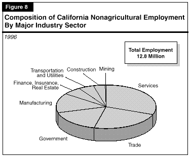 Figure 8 also indicates that about one-fourth of the workforce is in the trade sector, which includes retail stores, wholesalers, and import-export businesses. Another one-sixth of jobs is in manufacturing industries, including aerospace and commercial computers and electronics. (This sector's share of output in the economy significantly exceeds its share of employment, due to its high degree of automation.) The remaining jobs are in government, construction, finance-related, transportation, utilities, and various other smaller industry sectors.