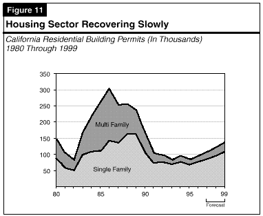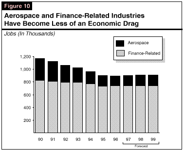 Figure 10 shows that aerospace and finance-related industries combined lost 264,000 jobs between 1990 and 1995. These declines added to the depth of the state's recession during the 1990 through 1993 period, and held down economy-wide growth during the early stages of the recovery.