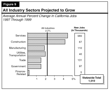 Services to Lead California's Economy. Figure 9 shows our outlook for job growth in individual industry sectors in California. It indicates that in both numeric and percentage growth terms, services will continue to lead the state's expansion over the next three years--accounting for over one-half of the 1 million in total new jobs projected to be created during this period. As in recent years, we expect that a large number of the new services jobs will be in high-paying, high-skilled job categories, including computer services, software design, and motion picture-related occupations.