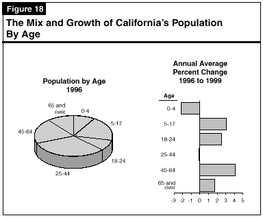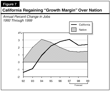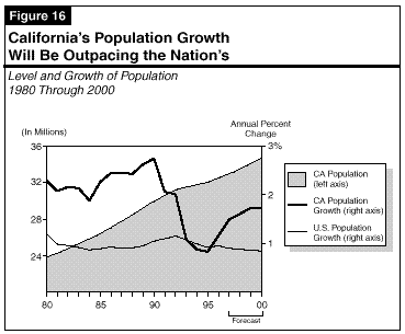 The figure also shows that the state's population growth rate fell below the nation's during the first half of the 1990s, largely reflecting the effects of the recession. However, this situation has reversed itself, and we expect California's population growth rate to outpace the nation's during the next three years.