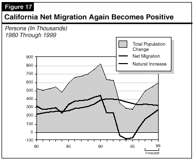 Substantial numbers of both domestic and foreign migrants made their way into California during the 1980s. California continued to experience a sizable in-flow of population from other countries during the first half of the current decade, but this gain was offset by a large-scale net out-migration of Californians to other states. While most demographers expect net foreign migration to remain stable in the next few years, projecting future domestic migration flows into and out of the state is the topic of some controversy (see shaded box on pages 48 and 49).