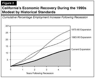 The impact of the economy on the state's budget condition has been particularly significant in recent years. California's severe recession in the early 1990s contributed to major funding shortfalls in the 1991-92 through 1994-95 General Fund budgets, while the subsequent and ongoing economic expansion has led to noticeable improvements in the budget's condition. The Governor's current budgetary proposal is predicated on continued, though moderating, economic growth through 1998.