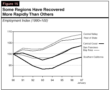 The figure shows that the recession that hit Northern California was comparatively mild, with the San Francisco Bay Area experiencing job losses of less than 2 percent between 1990 and 1993, and the Central Valley actually adding jobs during the period.