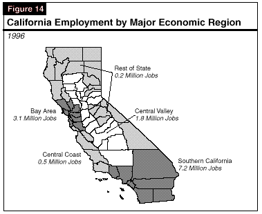 The remaining two regions--the Central Coast and the rest of the state--account for a relatively small share of California's jobs. However, they have experienced significant growth in recent years and should continue to do so in the future.