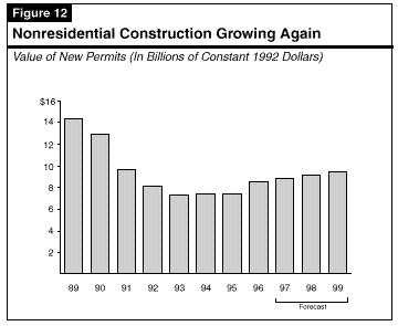 Figure 13 also shows that, relative to our November 1996 forecasts, we are now projecting slightly faster increases in employment and income, but slower gains in taxable sales. These adjustments primarily reflect the incorporation of more-recent historical revisions to employment, sales, and income data, rather than any fundamental reassessment of the basic economic outlook.