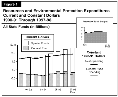 in the budget year rather than anticipated expenditures. As actual emergency firefighting expenditures exceed that base amount, additional funds will be provided through subsequent deficiency appropriations. The budget also proposes reductions in DPR's 1997-98 expenditures by 9.3 percent and reductions of 5.5 percent in the Department of Water Resources (DWR) expenditures. For DPR, the reductions are mainly in park development due to the depletion of park bond funds. In the case of DWR, reductions are due to an anticipated decline in expenditures for construction and operation of the State Water Project.