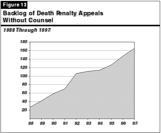 The Backlog of Death Penalty Cases Continues to Grow. As we reported last year, there has been considerable delay--generally three to four years--in appointing appellate counsel for indigent criminal defendants sentenced to the death penalty. Figure 12 shows that as of December 1997, there were 493 inmates under a death sentence awaiting appeal of their cases in state and federal courts. There are 315 direct appeal cases pending before the California Supreme Court. Appellate attorneys have been appointed to 150 of these cases. The remaining 165 cases are awaiting appointment of an attorney, an increase of 18 cases from a year ago. The backlog of inmates who are without defense counsel has increased substantially since 1989, when there were only 27 awaiting counsel. In recent years there has been an average of three new death penalty judgments per month, while defense counsel has been appointed for approximately two capital cases per month. Figure 13 shows how the backlog has increased over the last ten years.