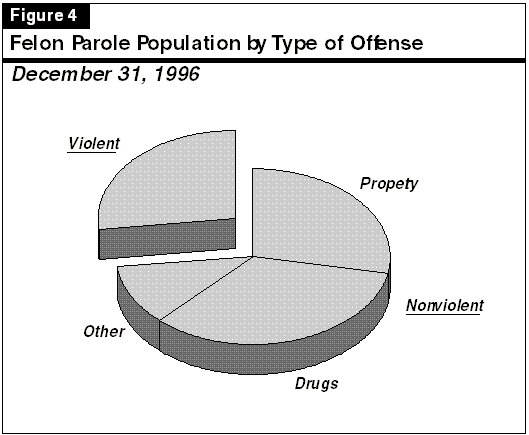 According to the most recently available demographic data, about 90 percent of the parole population is male. About 57 percent of the parole population is age 20 through 34. About 40 percent of parolees are Hispanic, 29 percent are white, and 27 percent are black. As shown below in Figure 4, almost three-fourths of the parole population was originally committed to prison for a nonviolent offense.