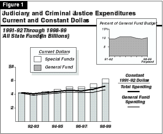 The budget proposes total expenditures of $6.3 billion for judiciary and criminal justice programs in 1998-99. This is an increase of $741 million, or 13 percent, over estimated current-year spending. This increase is due to a number of factors, including implementation of recent legislation requiring the state to take over a larger share of financial responsibility for trial courts from the counties, the projected increase in the state's prison inmate and parole populations, and declining federal fund support (and thus increased state costs) to pay the costs of incarcerating undocumented felons in state prison.