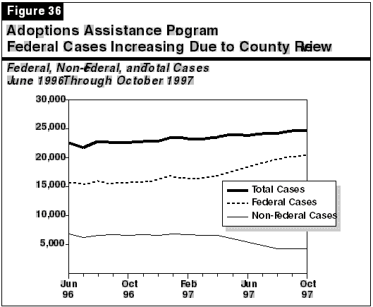 The budget estimates the proportion of AAP cases that are federally eligible using caseload data from June 1996 through April 1997. Beginning in May 1997, Los Angeles County corrected an error in its eligibility determination procedures that had resulted in many AAP cases that met the federal criteria being counted as not federally eligible. The county redetermined federal eligibility for all of its AAP cases, and a much larger proportion of cases have been determined to be federally eligible. Figure 36 shows that the changes reported by the county have substantially increased the statewide proportion of AAP cases that are receiving federal funding, with the percentage of federally eligible cases increasing from 72 percent in April 1997 to 83 percent in September 1997.