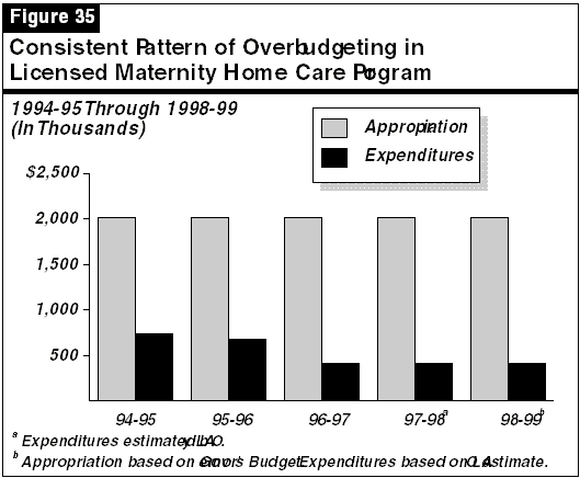 The LMHC program provides residential care and maternity-related services to unmarried pregnant women under the age of 18. The budget proposes General Fund expenditures of $2 million for support of the program in 1998-99. Figure 35 (see page 156) shows the amount of funds budgeted and spent by maternity homes since 1994-95. As the figure indicates, expenditures have fallen short of the amount appropriated for the program in the last three years. Based on our discussions with the department, we estimate that the program will revert $1.6 million to the General Fund in the current year.