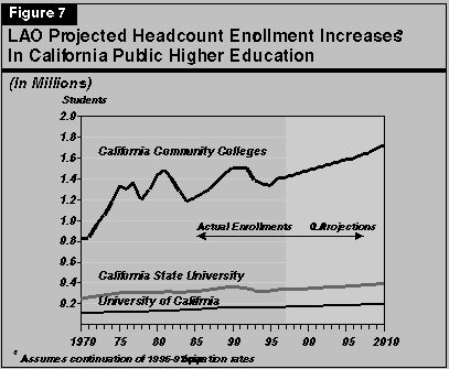 If participation rates remain what they were in 1996-97, enrollments in each of the three segments would grow by a total of 12 percent by 2005-06, or 1.3 percent per year over this nine-year period. By contrast, total enrollment in the three segments increased by an average of 1.9 percent per year from 1970 to 1996. From this perspective, accommodating enrollment growth should not be any more of a challenge in the next nine years than it has been since 1970.