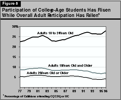 College Participation Is Up Among Young Adults.As Figure 8 shows, 23 percent of 18 to 24 year olds attended a public college or university in California in 1977. The participation rate of this group increased to 28 percent in 1996, the highest level in history. By contrast, the rate for those 25 years old and older fell from 5.4 to 4.2 percent over this same period. Because there are almost seven times as many adults 25 years old or older than there are in the 18 to 24 year old group, and because the percentage of older adults has increased significantly over the years, the overall participation rate for adults fell from 8.8 to 7.2 percent during this period.
