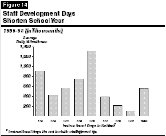 Current law permits schools to include up to eight staff development days within the 180-day instruction year. Staff development days provide teachers time away from the classroom for planning and training activities designed to improve the quality of education at the school site. Figure 14 shows the number of instructional days provided by California's school districts in 1996-97 (not including staff development days). On average, schools include four to five staff development days within their 180-day school year.