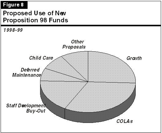 The 1998-99 Governor's Budget proposes to spend $30.8 billion in state and local Proposition 98 support for K-12 education. This represents an increase of $2 billion, or 6.9 percent, from the amount included in the 1997-98 Budget Act. The budget proposes to (1) provide growth and cost-of-living-adjustment (COLA) funds to virtually all programs and (2) spend $800 million to support state initiatives to improve the K-12 system. Figure 8 (see next page) illustrates the budget's proposed allocation of K-12 funds for 1998-99.