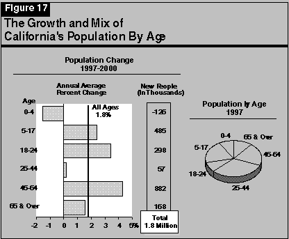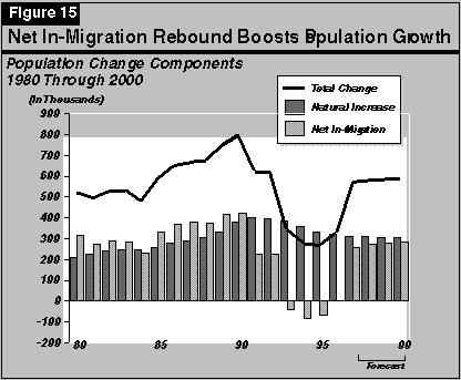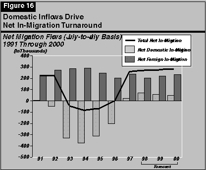 Figure 15 shows the state's annual population changes since 1980, and depicts the contributions of both natural increase and net in-migration to the overall changes. It shows that a sharp decline in net in-migration (and an actual net outflow in three of the years) is primarily responsible for the reduced annual population change experienced during the early 1990s. Indeed, while natural increase only declined gradually (reflecting declining fertility rates) between 1990 and 1995, net migration to California fell sharply, as the state's severe recession discouraged those who otherwise would have migrated to California in search of economic opportunities. Now that economic conditions have improved in the state, net in-migration has resumed; and we expect net in-migration to add an average of 275,000 persons annually between 1997 and 2000.