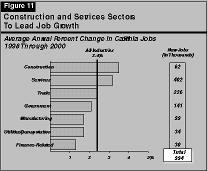 Services and Construction to Lead California's Economy. Figure 11 (see next page) shows our outlook for job growth in individual industry sectors in California. It indicates that in numeric terms, services employment is projected to be the fastest growing sector. As in past years, many of the new jobs will be in high-technology computer services, systems design, and software development occupations. The projected increases in residential and nonresidential building activity are expected to lead to major gains in construction employment.