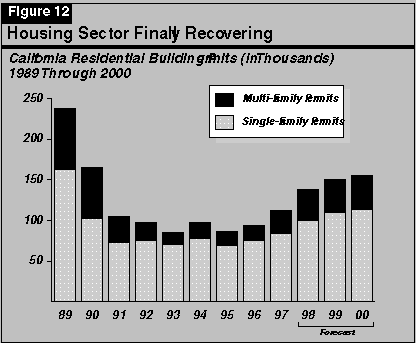 Home Construction to Continue Climbing in 1998. As indicated earlier, the long-awaited improvement in California home construction finally materialized in 1997. As shown in Figure 12, we assume that construction of both single-family and multi-family residential structures will continue to climb over the next three years.