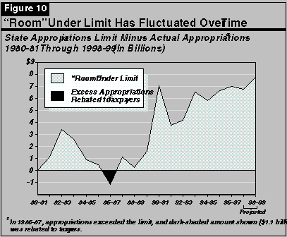 In his 1998 State of the State Address, the Governor expressed a desire to adjust the state appropriations limit (SAL) so as to make it more of a constraint on state spending. (Apparently, his changes would not affect local limits). Thus far, however, the administration has not released a specific proposal. As estimated in the budget, the limit is projected to exceed proposed appropriations by nearly $8 billion in 1998-99. This section explains what the appropriations limit is, how it is calculated, and its past and current budget-related implications.