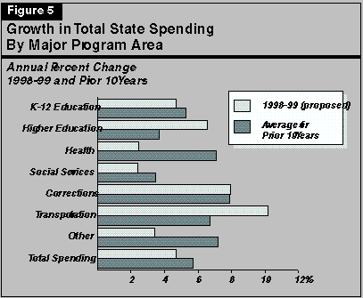 Growth Over the Past Decade. Over the past decade, total spending growth has averaged 5.7 percent annually, compared with the 4.7 percent 1998-99 proposed increase. Thus, the proposed budget-year rate of growth is below the average over the past decade. With regard to individual program areas, Figure 5 indicates that corrections and transportation have experienced the highest average rates of growth over the past ten years.