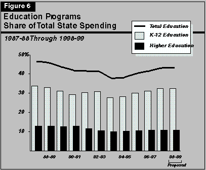 Figure 6 shows education programs' share of the budget since 1987-88. In 1987-88, almost half of total state spending was devoted to either K-12 or higher education programs. By 1993-94, however, education's percentage of total state spending had fallen to 38 percent. Since then, though, education's share has trended back up. Under the Governor's proposal, it would reach 43 percent in 1998-99, a slight rise from the current year.
