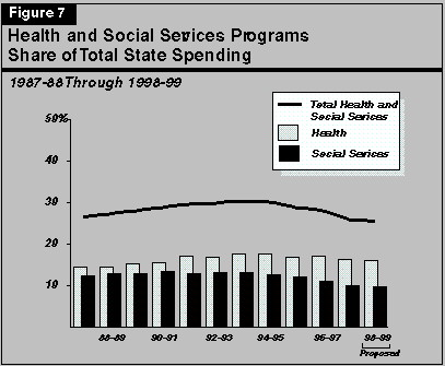 Over the past decade, the health programs share of state spending rose from 14 percent to a peak of almost 18 percent in 1993-94, then stabilized and subsequently has drifted down a bit. The proposed share for 1998-99 is slightly under 16 percent (see Figure 7). Rising welfare-linked caseloads and rapid increases in the cost of providing health care were the main causes of the share's increase prior to 1993-94. The falling off of the share since that time reflects such factors as declining welfare caseloads and a stabilization of other components of the Medi-Cal caseload.