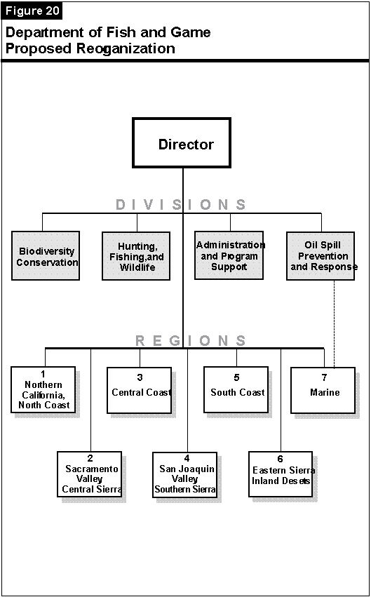 Regional Changes Would Increase Focus on Marine Habitat. The reorganization would increase the number of regions from five to seven by creating two new regions. The department has attempted to divide the state into regions that contain similar natural ecosystems. By doing this, the department hopes to be able to manage the state's fish and wildlife more effectively. Specifically, one additional region would be created by splitting the former Region 5 (which covered most of Southern California) into two regions (Region 5 and Region 6). The new Region 5 would cover the south coast, while Region 6 would cover the inland deserts and eastern Sierras. The DFG maintains that this split will enable it to manage more effectively this vast geographical area with diverse wildlife populations and habitats.