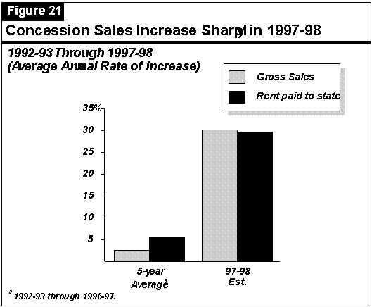 State's Share of Concession Revenues Increasing. Our review shows that revenues from concessions have increased in recent years. As Figure 21 shows, from 1992-93 through 1996-97, total gross revenues earned by state park concessions grew at an annual rate of 2.6 percent (from $52 million to $58 million). During the same period, rental payments to the state increased by an average annual growth rate of 5.6 percent (from $5.6 million to $6.9 million). Rental revenues have increased at a higher rate than concession gross revenues primarily because many old contracts have expired, and have since been renegotiated at higher rents.