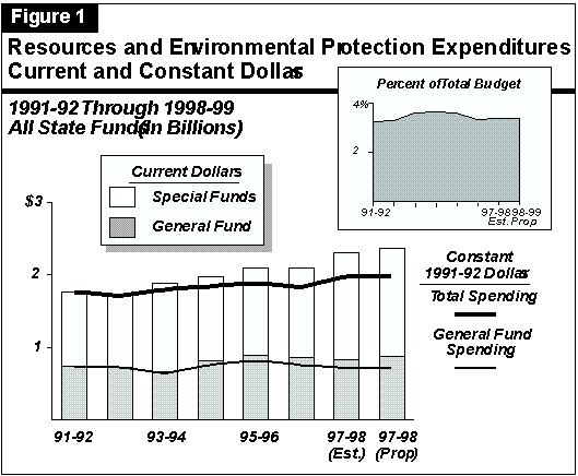 Figure 1 (see next page) shows that state expenditures for resources and environmental protection programs increased by approximately $596 million since 1991-92, representing an average annual increase of approximately 4.3 percent. This increase primarily reflects the establishment of various programs to address environmental problems such as leaking underground tanks, hazardous waste sites, and solid waste generation. When adjusted for inflation, these expenditures increased at an average annual rate of 1.5 percent. General Fund expenditures increased at an average annual rate of about 2.3 percent over this period. When adjusted for inflation, annual General Fund expenditures decreased slightly during this period at an average annual rate of 0.4 percent.