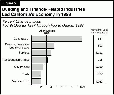 Job Performance By Industry. Figure�2 shows that all major employment categories increased between the fourth quarter of 1997 and the fourth quarter of 1998. The fastest growing sectors were construction, finance, and services, reflecting increases in consumer spending and real estate activity. More modest gains were posted by the transportation/utilities, trade, government, and manufacturing sectors.