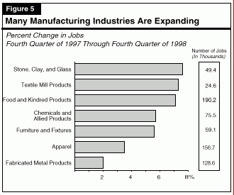 Even within the manufacturing sector there was a notable split between the performance of the high-tech category and other industry categories during the year. In terms of jobs, the declines in high-tech manufacturing were offset by increases in a number of other sectors. Such building-related sectors as stone-clay-glass and furniture-fixtures posted healthy gains during 1998 (see Figure�5).