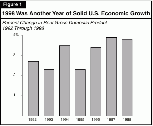 The U.S. economic expansion entered its eighth year in 1998, and is showing no signs of faltering. As shown in Figure�1, real gross domestic product (GDP) increased by 3.8�percent in 1998, the fourth year in the past five that growth in U.S. economic output has exceeded 3�percent. Growth in 1998 significantly exceeded the consensus of forecasts made at the beginning of the year (which called for a 2.5�percent increase).