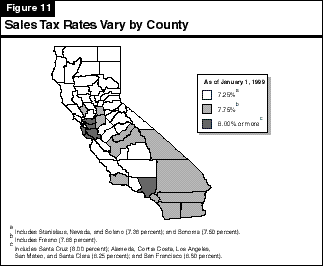 Combined State and Local Tax Rates. The combined state and local sales and use tax rate varies significantly across California. As shown in Figure 11, the combined rate currently ranges from 7.25 percent for counties that impose no optional sales taxes, up to 8.5 percent in the City and County of San Francisco. No county currently imposes the maximum allowable 8.75 percent rate.